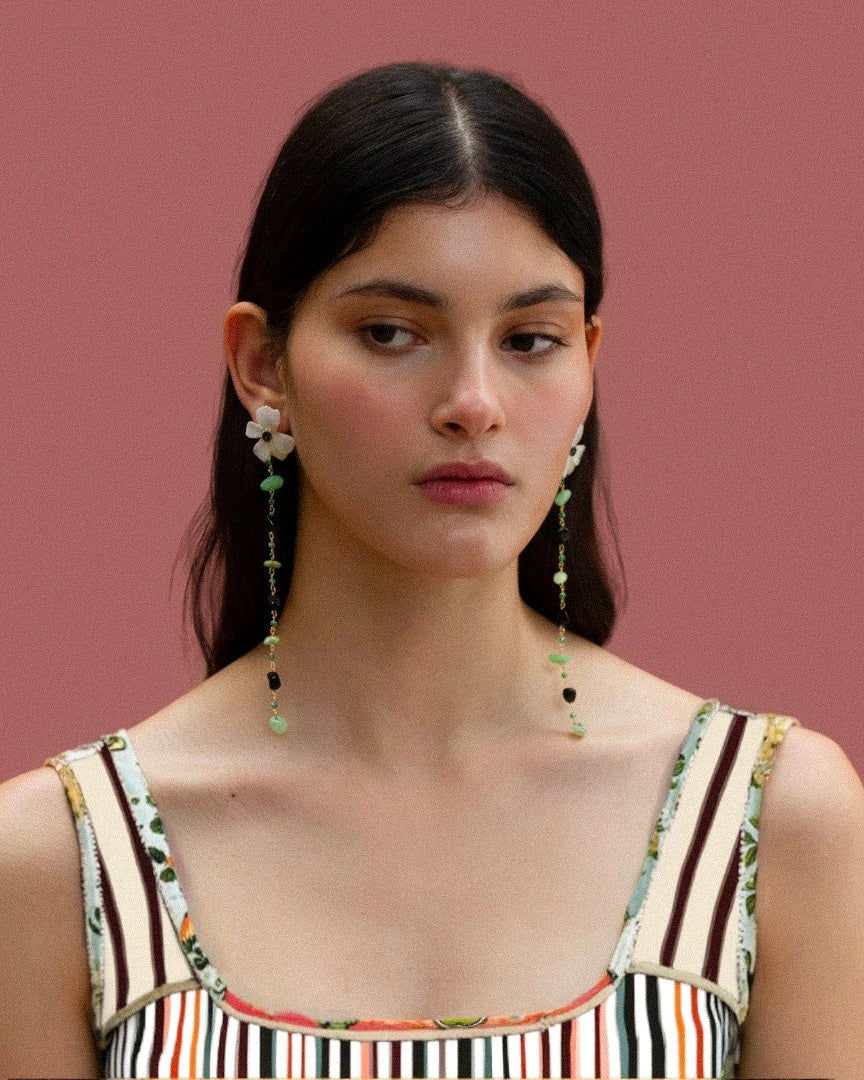 Metallic drop earrings with a delicate floral design at the top. Crafted with a handmade brass wire chain, they are adorned with semi-precious stones in soft green and black tones, along with contrasting beads that bring vibrancy and elegance. A unique artisanal piece with an original design, ideal to complement both day and evening looks.